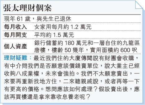 最後,關於賣出單位後,應該如何處理收回來的資金。翻查一些新聞,九龍區的舊樓遇重建的收購價,曾見13000元一呎,張太單位600呎,估計可收回約800萬元的資金,應該足夠再購買呎數稍微小一點的有電梯新樓,改善居住條件。