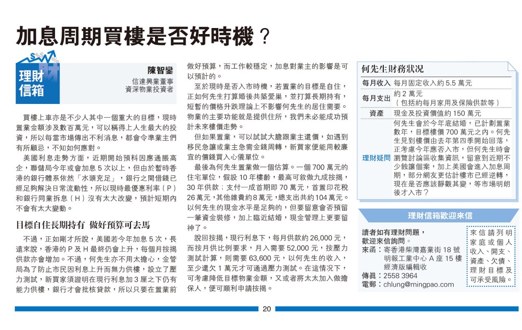 最後為何先生置業做一個估算。一個700萬元的住宅單位,假設10年樓齡,最高可敘做九成按揭,30年供款;支付一成首期即70萬元,首置印花稅26萬元,其他雜費約8萬元,總支出共約104萬元。以何先生的現金水平是足夠的,但要留意會否預留一筆資金裝修,加上臨近結婚,現金管理上更要留神了。
