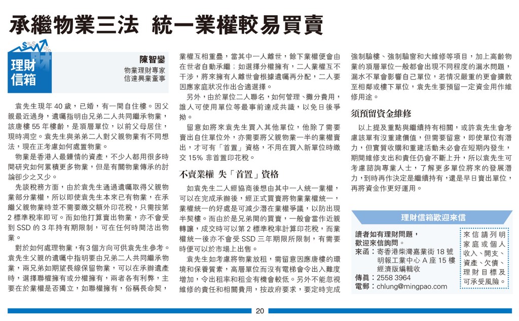 先談稅務方面,由於袁先生通過遺囑取得父親物業部分業權,所以即使袁先生本來已有物業,在承繼父親物業時並不需要繳交額外印花稅,只需按第2標準稅率即可。而如他打算賣出物業,亦不會受到SSD的3年持有期限制,可在任何時間沽出物業。