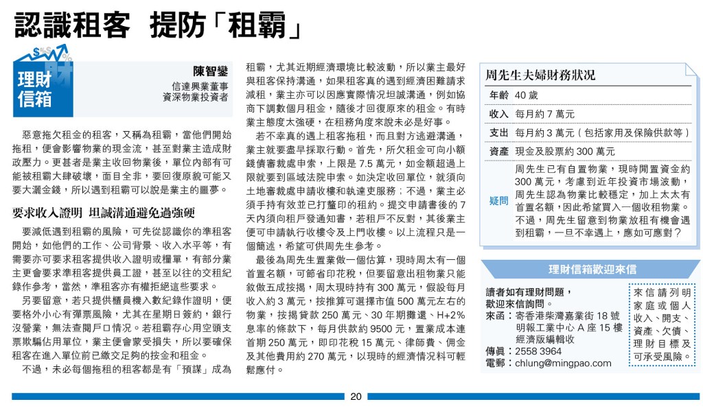 要減低遇到租霸的風險,可先從認識你的準租客開始,如他們的工作、公司背景、收入水平等,有需要亦可要求租客提供收入證明或糧單,有部分業主更會要求準租客提供員工證,甚至以往的交租紀錄作參考,當然,準租客亦有權拒絕這些要求。