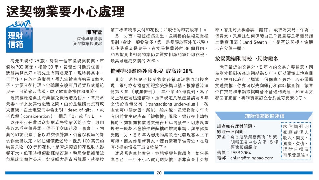 另一方面,要提提馮先生,送契樓的按揭及業權限制,會比一般物業多,第一是受限於額外印花稅,即使受贈者是兒子,在接受物業後的36個月內,如希望賣出相關物業仍要繳交相應的額外印花稅,最高可達成交價的20%。