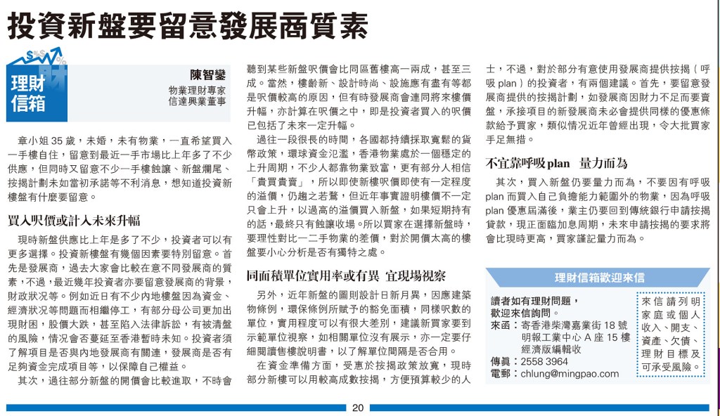 【明報專訊】章小姐35歲,未婚,未有物業,一直希望買入一手樓自住,留意到最近一手市場比上年多了不少供應,但同時又留意不少一手樓蝕讓、新盤爛尾、按揭計劃未如當初承諾等不利消息,想知道投資新樓盤有什麼要留意。