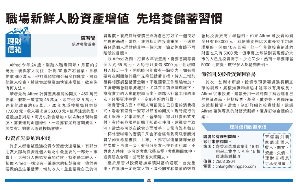 陳智鑾:職場新鮮人盼資產增值 先培養儲蓄習慣