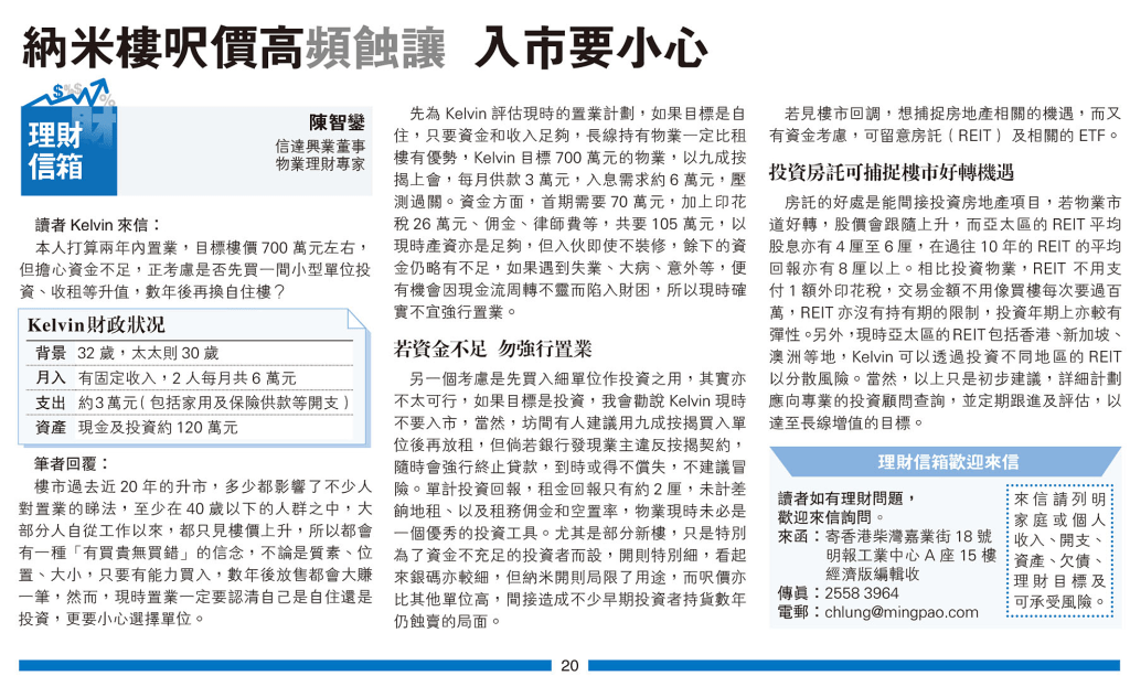 另一個考慮是先買入細單位作投資之用,其實亦不太可行,如果目標是投資,我會勸說Kelvin現時不要入市,當然,坊間有人建議用九成按揭買入單位後再放租,但倘若銀行發現業主違反按揭契約,隨時會強行終止貸款,到時或得不償失,不建議冒險。單計投資回報,租金回報只有約2厘,未計差餉地租、以及租務佣金和空置率,物業現時未必是一個優秀的投資工具。尤其是部分新樓,只是特別為了資金不充足的投資者而設,開則特別細,看起來銀碼亦較細,但納米開則局限了用途,而呎價亦比其他單位高,間接造成不少早期投資者持貨數年仍蝕賣的局面。