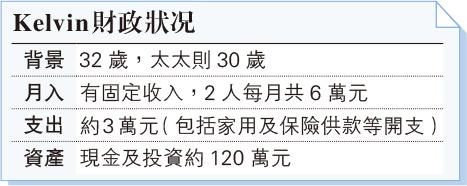 先為Kelvin評估現時的置業計劃,如果目標是自住,只要資金和收入足夠,長線持有物業一定比租樓有優勢,Kelvin目標700萬元的物業,以九成按揭上會,每月供款3萬元,入息需求約6萬元,壓測過關。資金方面,首期需要70萬元,加上印花稅26萬元、佣金、律師費等,共要105萬元,以現時產資亦是足夠,但入伙即使不裝修,餘下的資金仍略有不足,如果遇到失業、大病、意外等,便有機會因現金流周轉不靈而陷入財困,所以現時確實不宜強行置業。