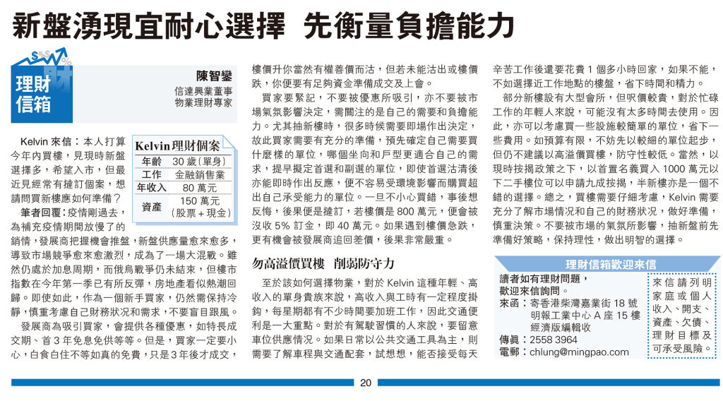 【明報專訊】Kelvin來信:本人打算今年內買樓,見現時新盤選擇多,希望入市,但最近見經常有撻訂個案,想請問買新樓應如何準備?