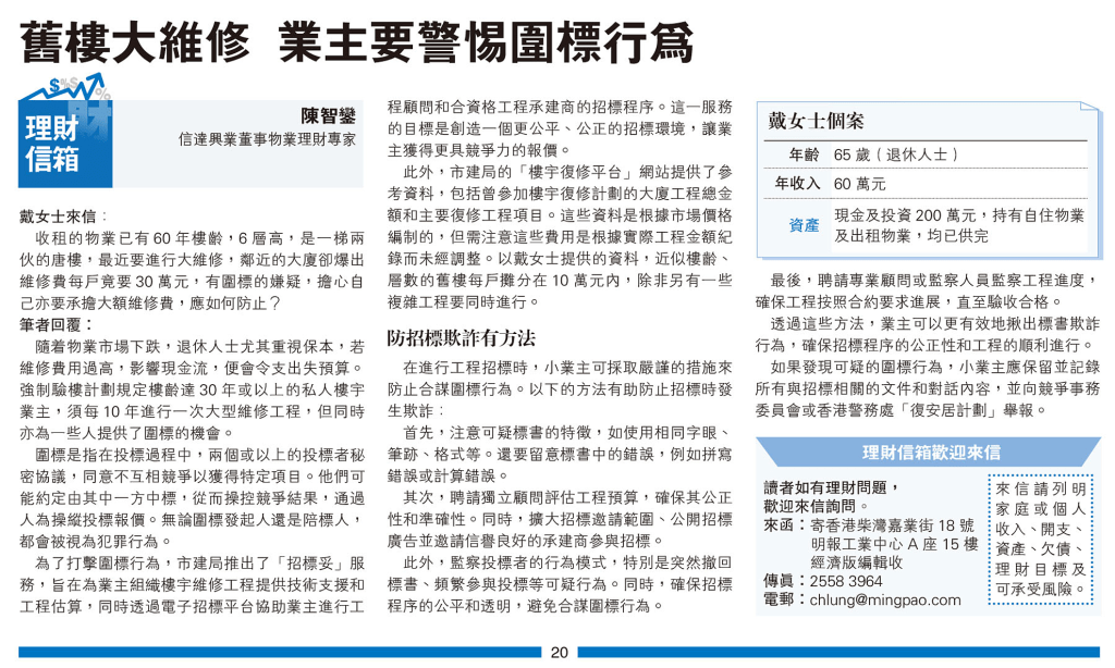 收租的物業已有60年樓齡,6層高,是一梯兩伙的唐樓,最近要進行大維修,鄰近的大廈卻爆出維修費每戶竟要30萬元,有圍標的嫌疑,擔心自己亦要承擔大額維修費,應如何防止?