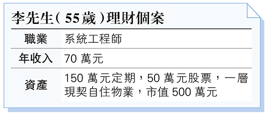 股債混合資產可以通過配置不同風險水平的資產來實現風險分散和穩定回報。選擇一些收益穩定的債券基金和股票基金,形成一個多元化的投資組合。這樣既能在市場上行時獲利,也能在市場下行時提供一定的保護。當中有派息的投資產品,息率6厘至9厘的選擇不少,這些產品在提供穩定收益的同時,風險亦較純股票投資低,適合目前市場環境。最後,建議李先生如有需要,聯絡專業的理財顧問,以獲得更詳細的建議和指導。
